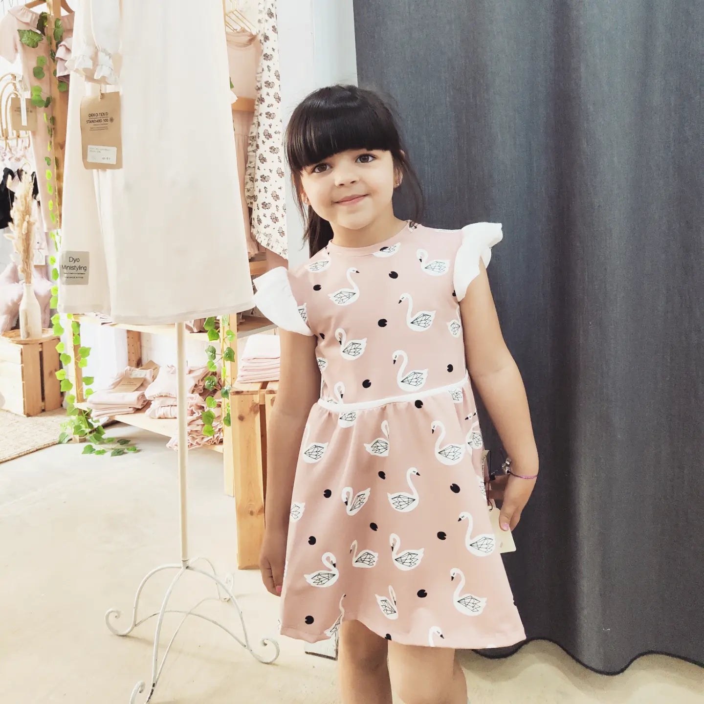 Vestido de Cisnes en tejido elástico Ecológico Sin Tóxicos con volante en el hombro. De fácil lavado en máquina máximo 30°. SIN TÓXICOS Y SIN NINGÚN PRODUCTO NOCIVO PARA LA SALUD. Máxima calidad!. No lleva botones ni cremalleras. Fácil de poner y quitar gracias a la elasticidad del tejido.