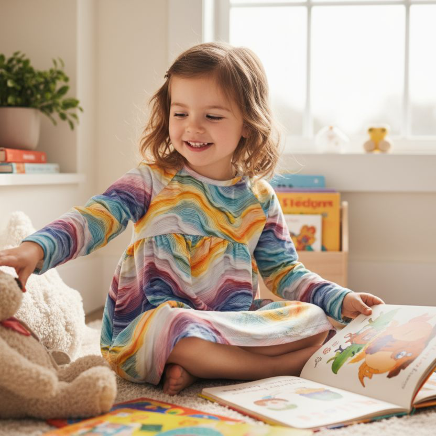 Vestido manga larga con estampado arco iris exclusivo de Dyo. Tejido afelpado suave.