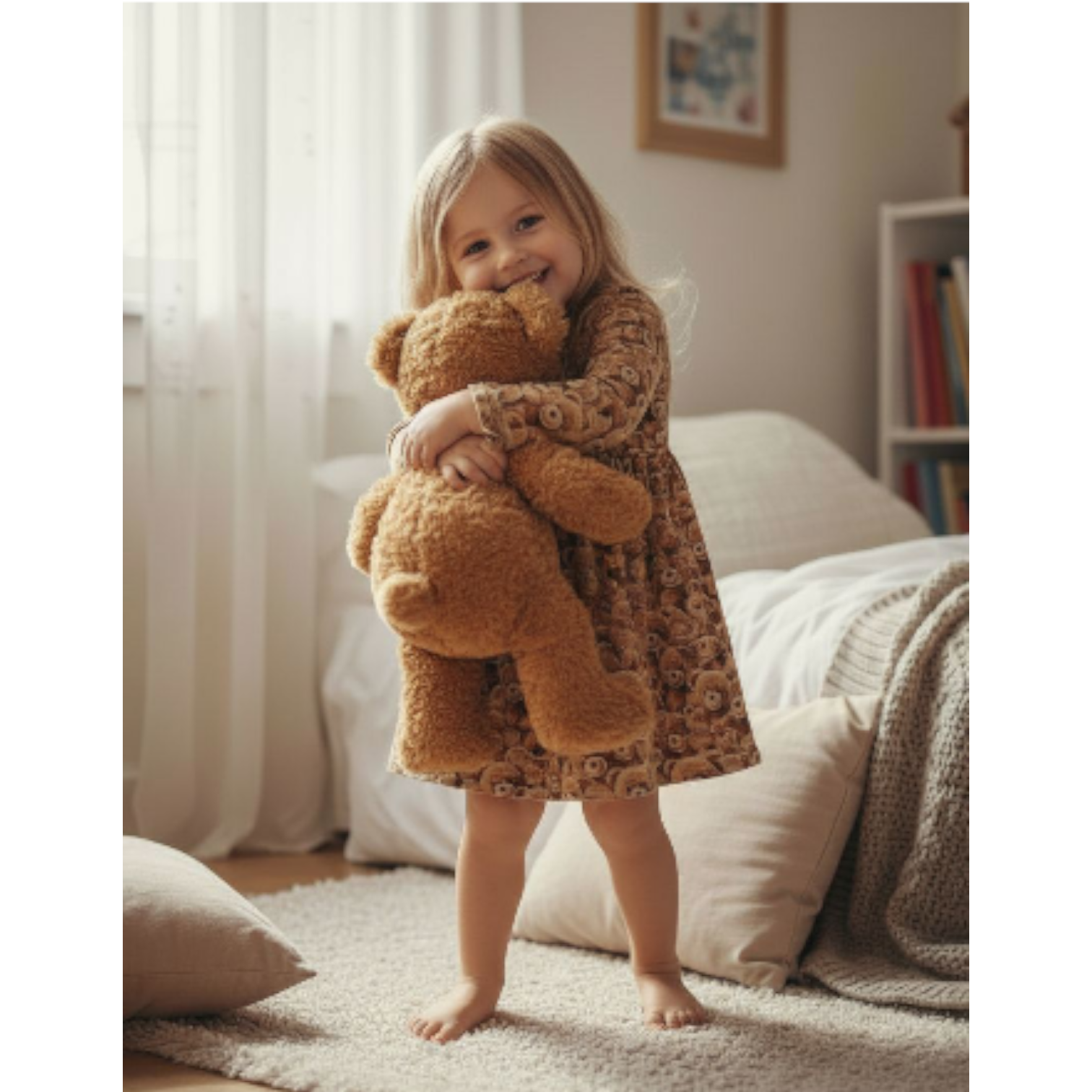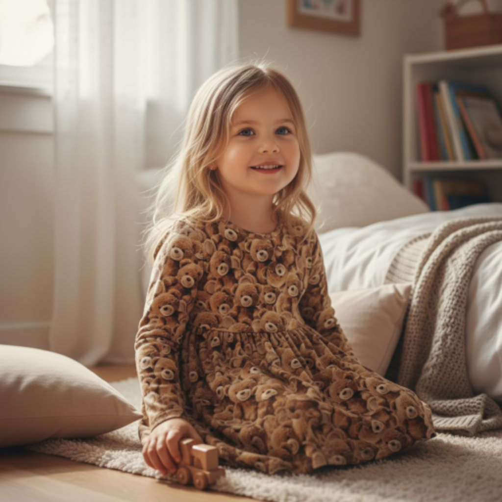 Vestido manga larga con estampado osos exclusivo de Dyo. Tejido afelpado suave.